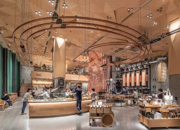 Customers entering the Roastery will be greeted by the brand's largest coffee bean-roasting cask: more than 55 feet of blush-tinted copper adorned with hand-crafted copper cherry blossoms, which changes hues throughout the day in different lights.